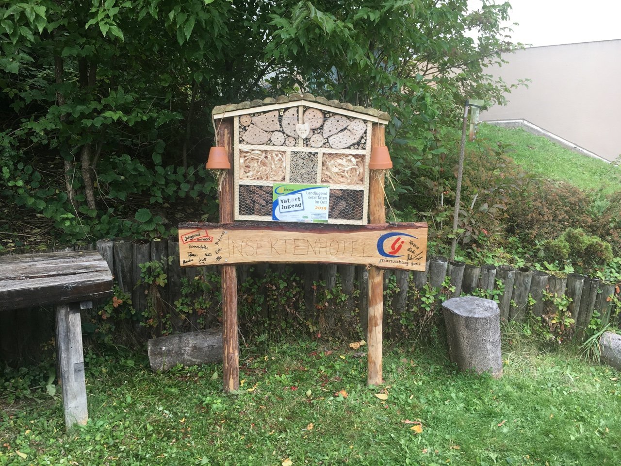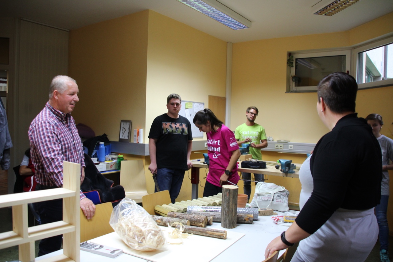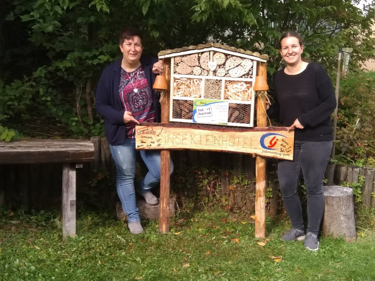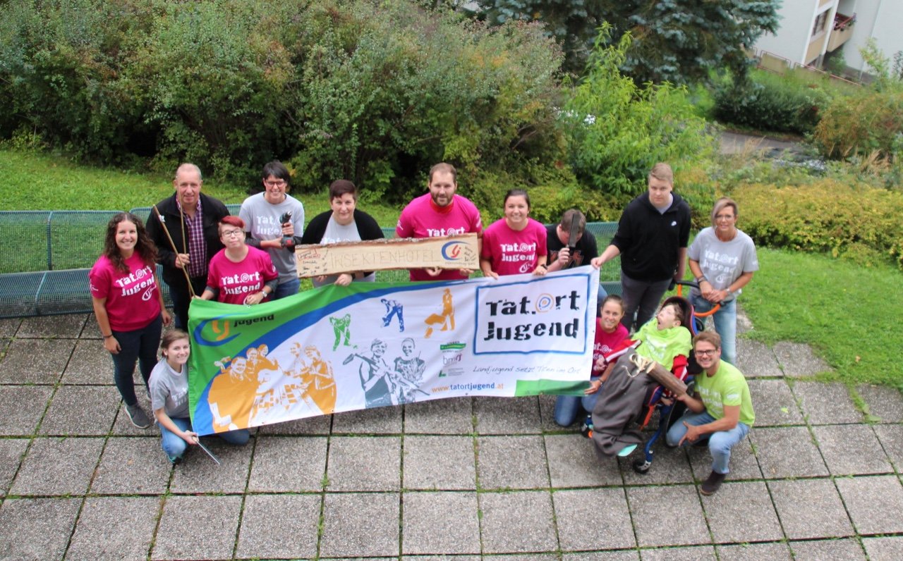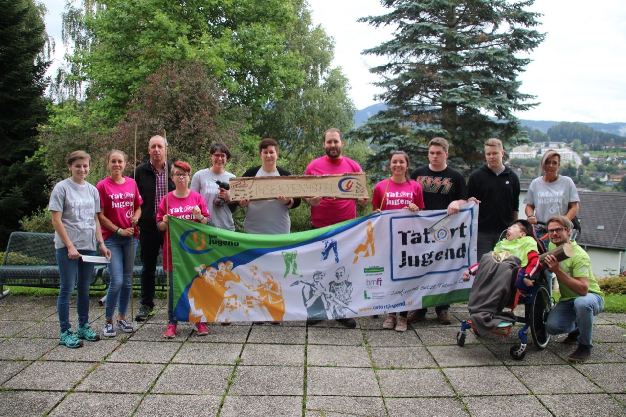 Ein voller Erfolg! Nicht nur für zahlreiche Insekten, sondern auch für uns als Ortsgruppe Mürzzuschlag-Ganz! Am 26. September besuchten wir im Rahmen des Projektes „Biotopia – fliegen, flattern, fördern“ die Einrichtung Jugend am Werk in Mürzzuschlag und bauten zusammen mit den Jugendlichen aus der TaB-Gruppe ein Insektenhotel. Sowohl die Burschen und Mädels als auch die Betreuer erwarteten uns schon voller Vorfreude und empfingen uns aufs Herzlichste. Wir stellten uns als Landjugend vor und erklärten den Jugendlichen kurz, was wir heute gemeinsam bauen werden. Als kleine Stärkung vorweg gab’s eine Kaffee- und Kuchenpause, wo wir mit den Teilnehmern ins Gespräch kamen und eine lockere Atmosphäre entstand. Als Einstieg durften wir zudem einen Experten in unserer Mitte begrüßen. Ein Imker aus unserer Region schaute vorbei und erzählte uns Wissenswertes über Wildbienen und den Bau eines Insektenhotels. Gleich im Anschluss legten wir voll motiviert los und begannen das Gerüst des Insektenhotels zusammenzuschrauben. Einige Mädels von Jugend am Werk brachten sich sofort ein und übernahmen mit Hilfestellungen unsererseits das Bohren und Schrauben. Inzwischen unterstützen die anderen Landjugendmitglieder den Rest der Jugendlichen dabei, Holz zu durchsägen, Bambusstäbe zurecht zu schneiden und Löcher zu bohren. Wir hatten große Freude daran, den Teilnehmern etwas Neues zu zeigen und ihnen verschiedenste Tätigkeiten beizubringen. Viele der Burschen und Mädels hatten bislang keinerlei Erfahrungen in der Holzarbeit bzw. wussten nicht wie man Werkzeuge benutzt. Aufgrund dieses Projektes lernten die Jugendlichen nicht nur Wichtiges beim praktischen Arbeiten, sondern zudem wurden ihre motorischen Fähigkeiten gestärkt. Wir konnten miterleben, wie die Jugendlichen, bei dem was sie taten, voll aufblühten und jede Menge Spaß am Bohren, Sägen und Hämmern hatten. Sie waren aktiv, lachten herzlich und brachten sich von selber ein um eine Aufgabe zu übernehmen. Als das Gerüst fertig war, ging’s ans Befüllen des Insektenhotels. Wir hatten Hartholz, Bambusstäbe, Forsythien und Zäpfen als Material zur Verfügung. Als kleine Überraschung brachten wir den Jugendlichen noch ein selbstgebautes Holzschild mit der Aufschrift „Insektenhotel“ mit, auf dem jeder von ihnen unterschreiben durfte. Als Abschluss wurde das Insektenhotel im Garten von Jugend am Werk aufgestellt und noch mit einem kleinen Herz ausgestattet. Viele freie Zimmer in unserem Insektenhotel sind geschaffen worden, die bereit sind belegt zu werden!