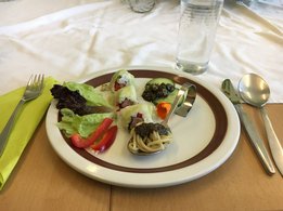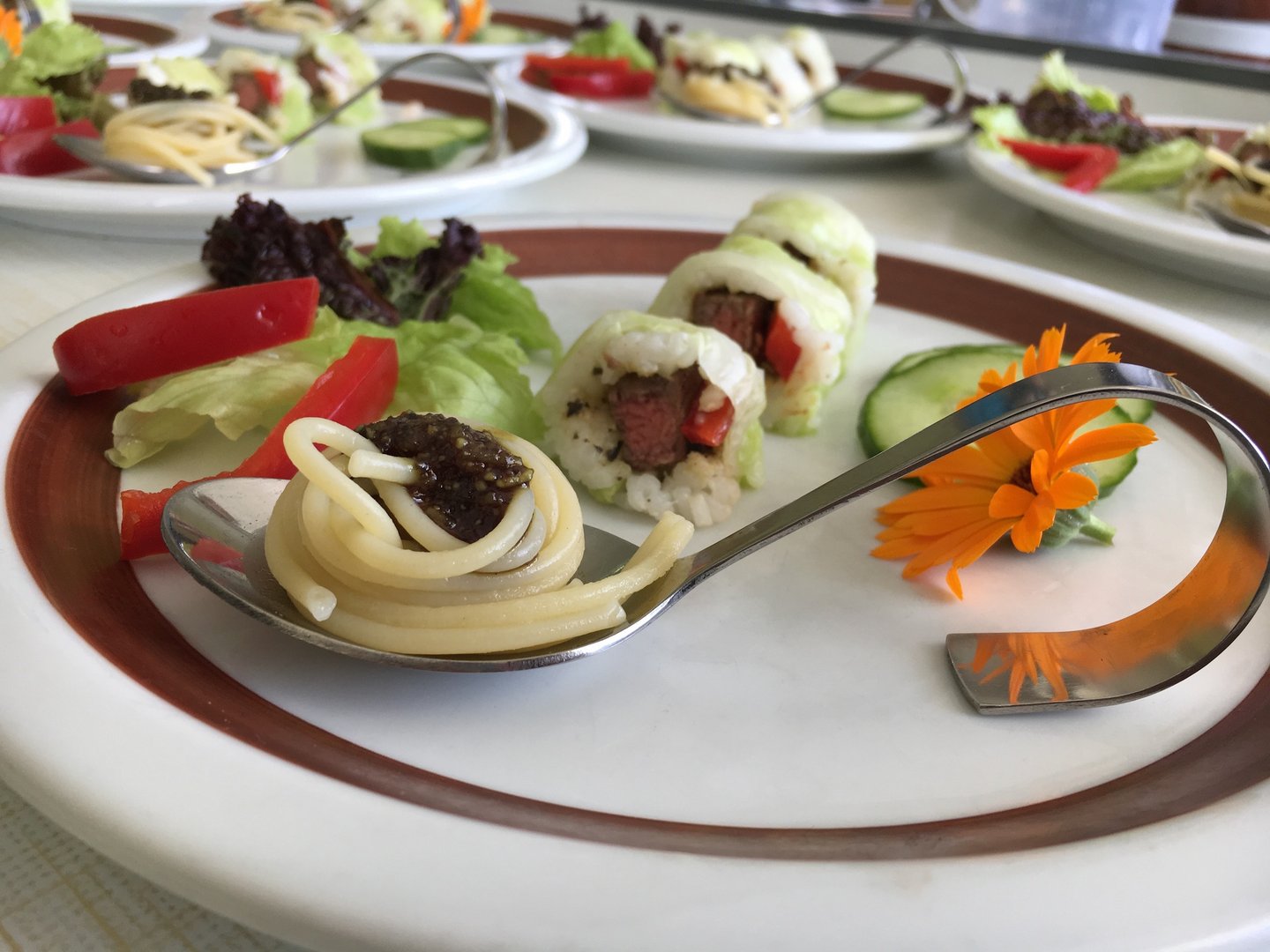 Steirersushi mit Salatdeko und Spaghetti mit Kürbiskernpesto