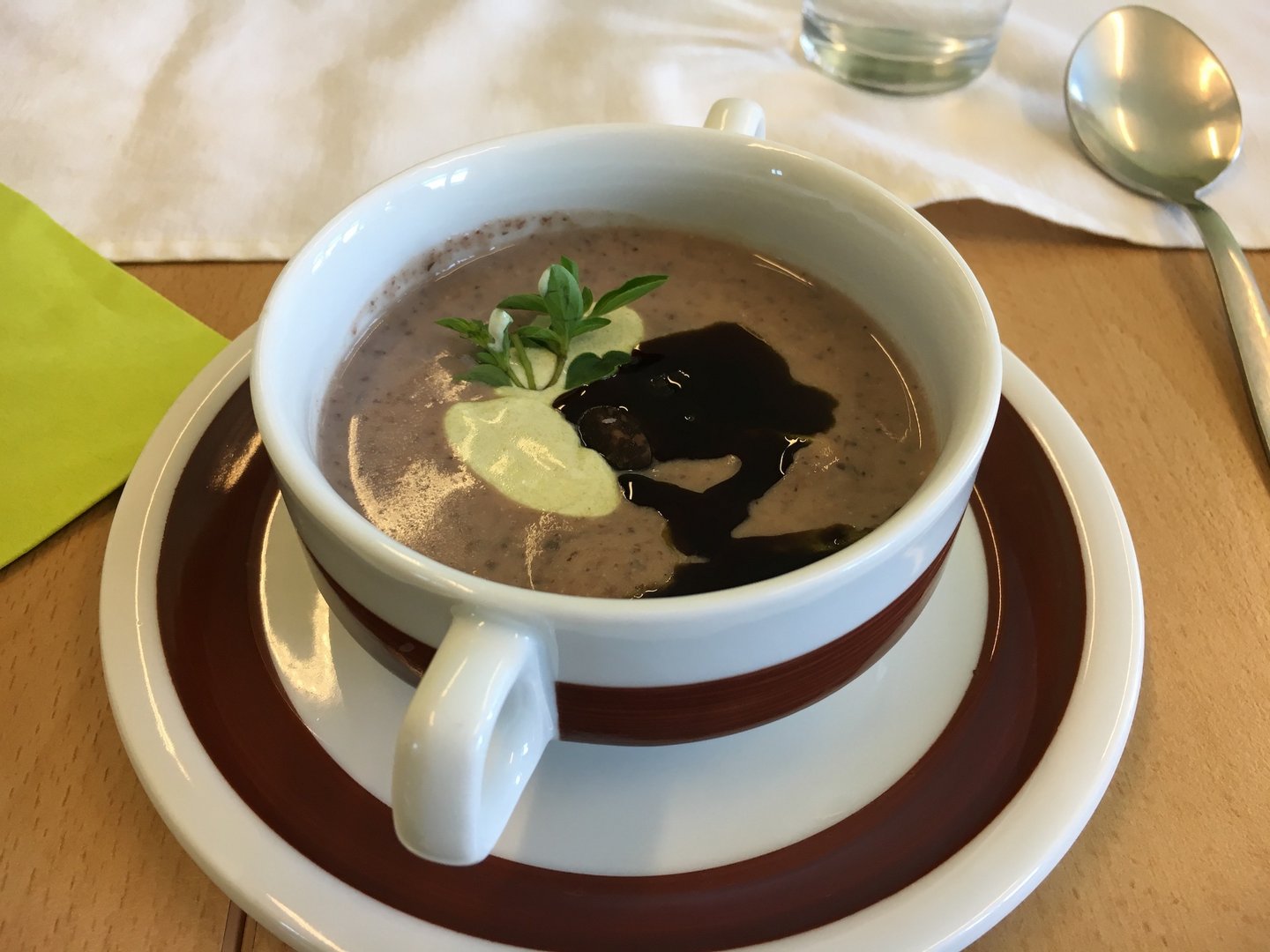 Käferbohnenschaumsuppe mit Kernölsauerrahm und Käferbohnenmuffins