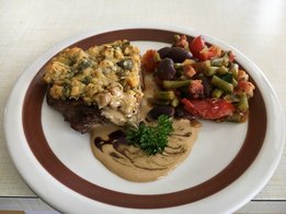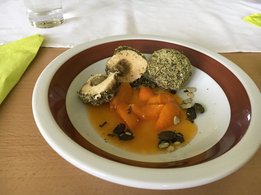 Beiriedschnitte mit Kürbiskernkruste und Käferbohnengemüse